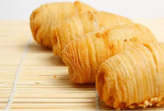 上海改良自法式點心Palmier,用高筋和低筋面粉加黃油油酥烘焙制作而成,成品呈現蝴蝶狀故名,表面細細砂糖但酥中卻略帶咸,膨松酥脆可口。國際飯店西餅屋最好。