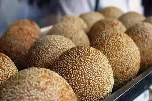 又名黃金大麻餅,發好的圓形面餅上籠蒸熟后,撒上芝麻,過一下油出鍋。表面松脆,內里松軟多孔,一層層的。一般無餡,也有豆沙和棗泥的。