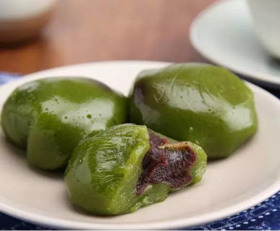 青團是清明節時令小吃,亦是寒食節的傳統冷食,青團用漿麥草汁或青艾汁或綠色蔬菜汁和糯米粉搗制再以豆沙餡或芝麻餡而成,蒸熟出籠時用毛刷將熟菜油均勻地刷在團子的表面,青團碧青油綠,糯韌綿軟,甘甜細膩。