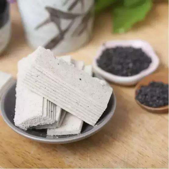 云片糕的糕粉很講究,糯米要碾去米皮,留下米心。磨得極細,連續過篩,綿細如面,炒熟,且要保持白凈,然后存放半年后拌合極細的砂糖使用。摻合豬油、欖仁、芝麻、香料拌勻,壓縮成形。最后由鋒利的大方刀,切成片片,薄如書頁即成。