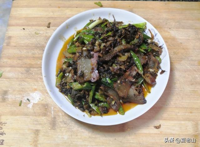 6.一道色澤金黃油亮,味道醇香爽口的老咸菜炒臘肉就可以上桌了。全程無須添加任何調料。